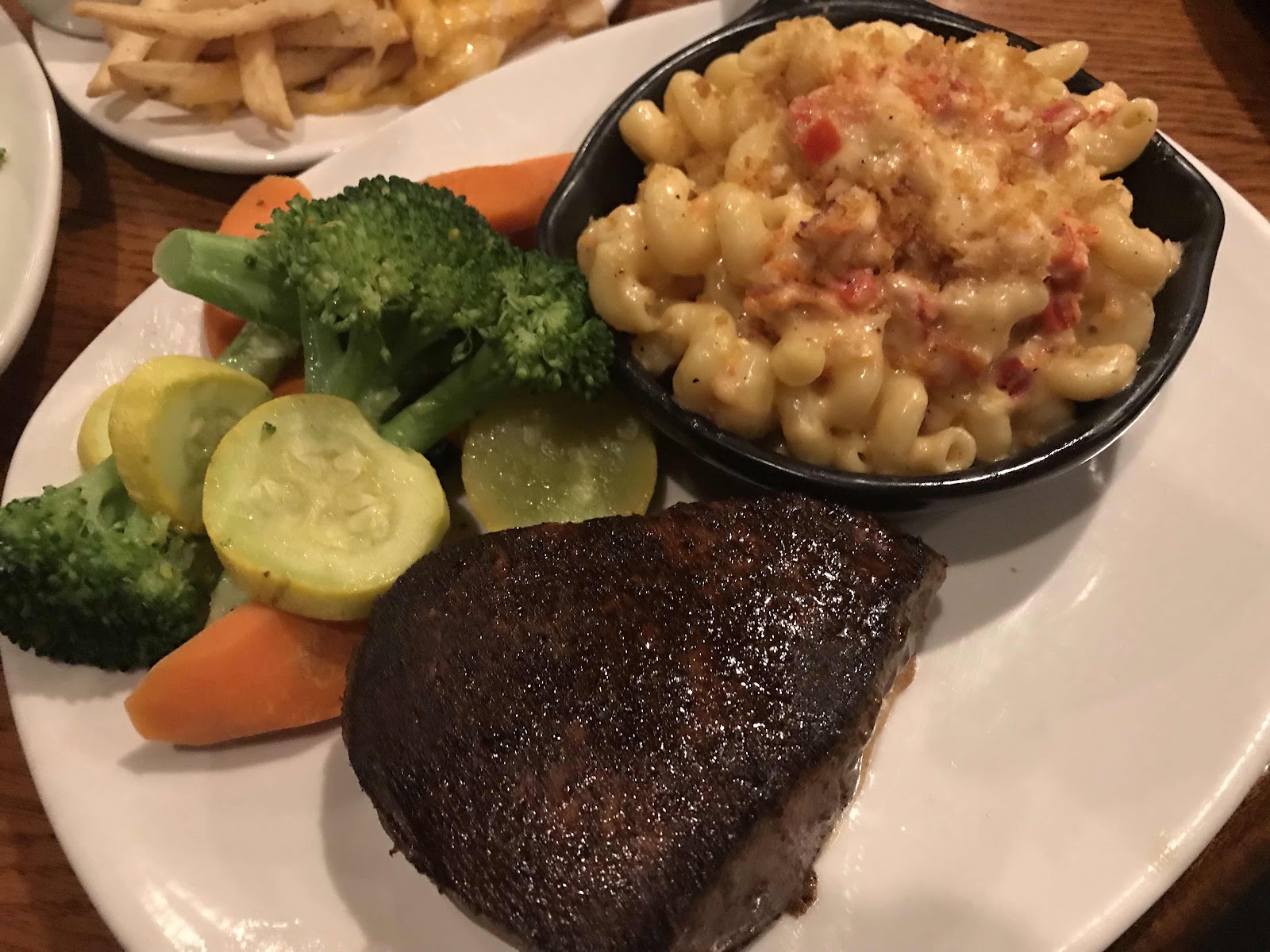 It had been a while since I'd been to an Outback Steakhouse, but I remembered how good the Victoria's Filet Mignon was and had to have that. I paired it with the lobster mac & cheese, a fitting dish for the first cold day of the season. When the temps drop 30 degrees in a matter of hours, comfort food is definitely in order - and is there a more appropriate comfort food than cheesy pasta? This dish had cavatappi pasta with smoked Gouda and Jack cheese, tender chunks of lobster and a crunchy topping.