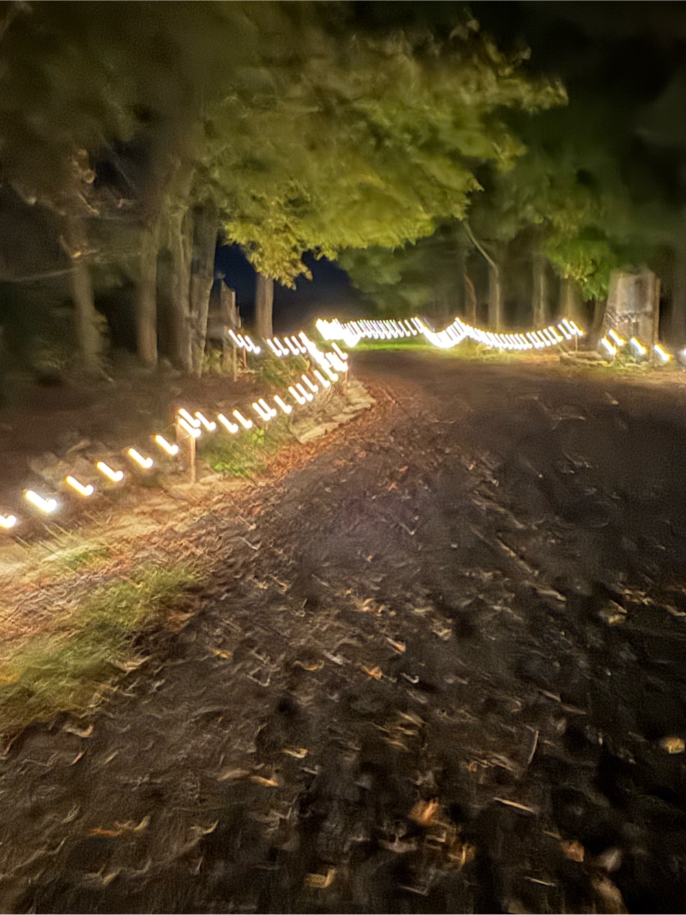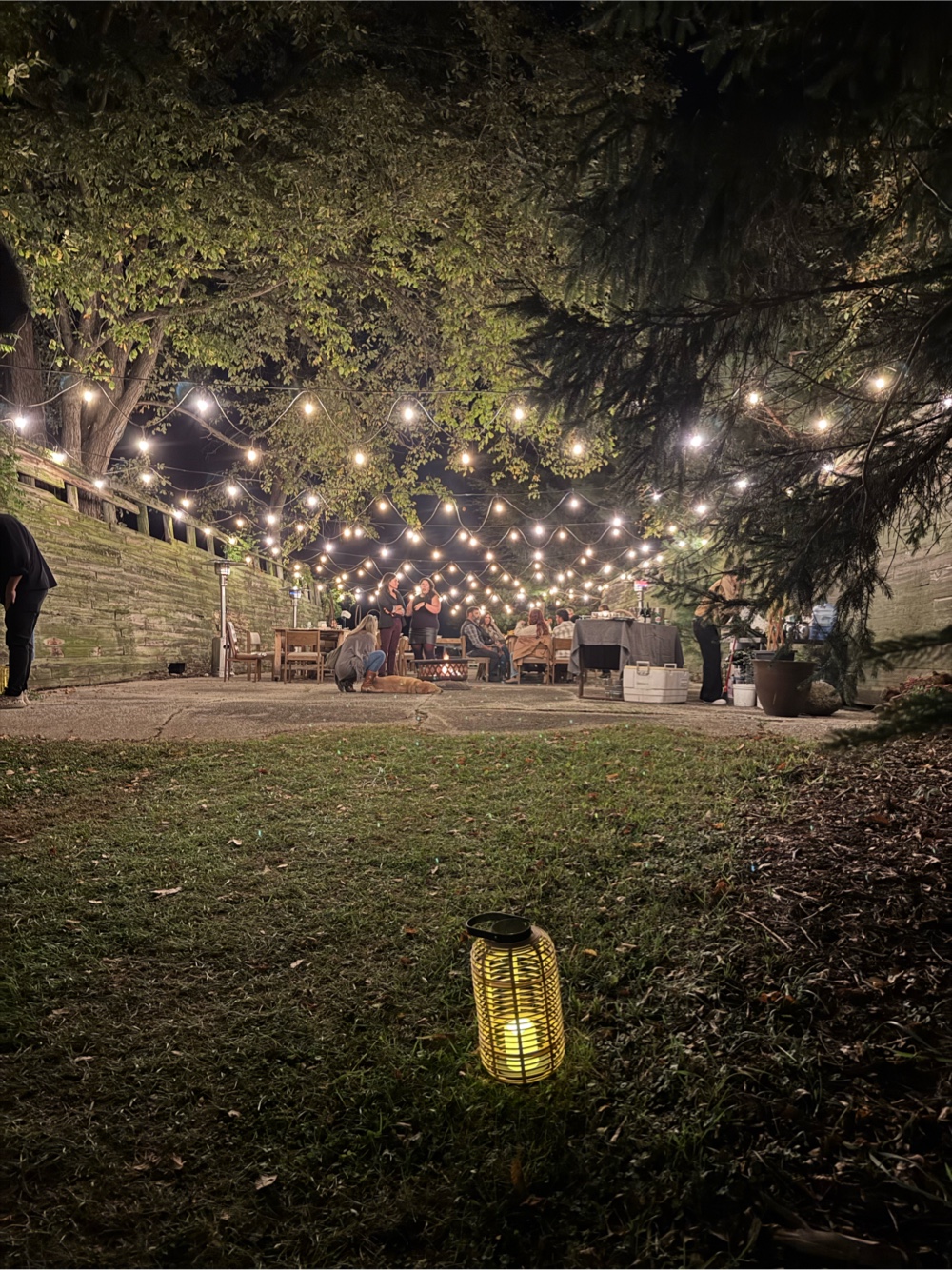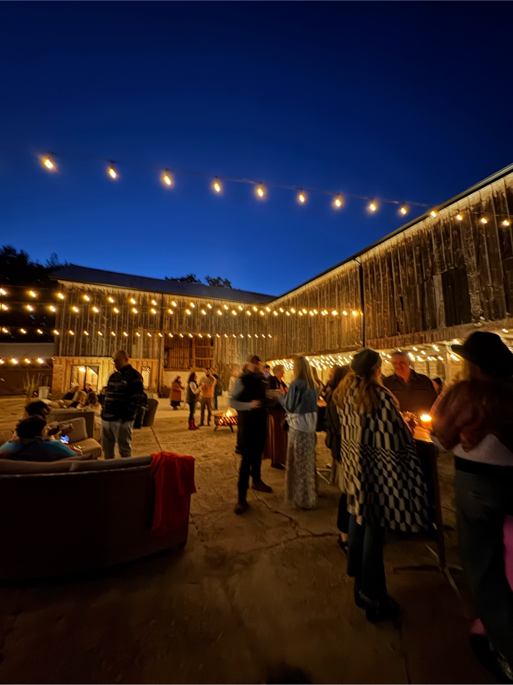 Rustic farm buildings are adorned with strings of twinking lights, making it sparkle like a scene from a rustic, rural fairy tale.