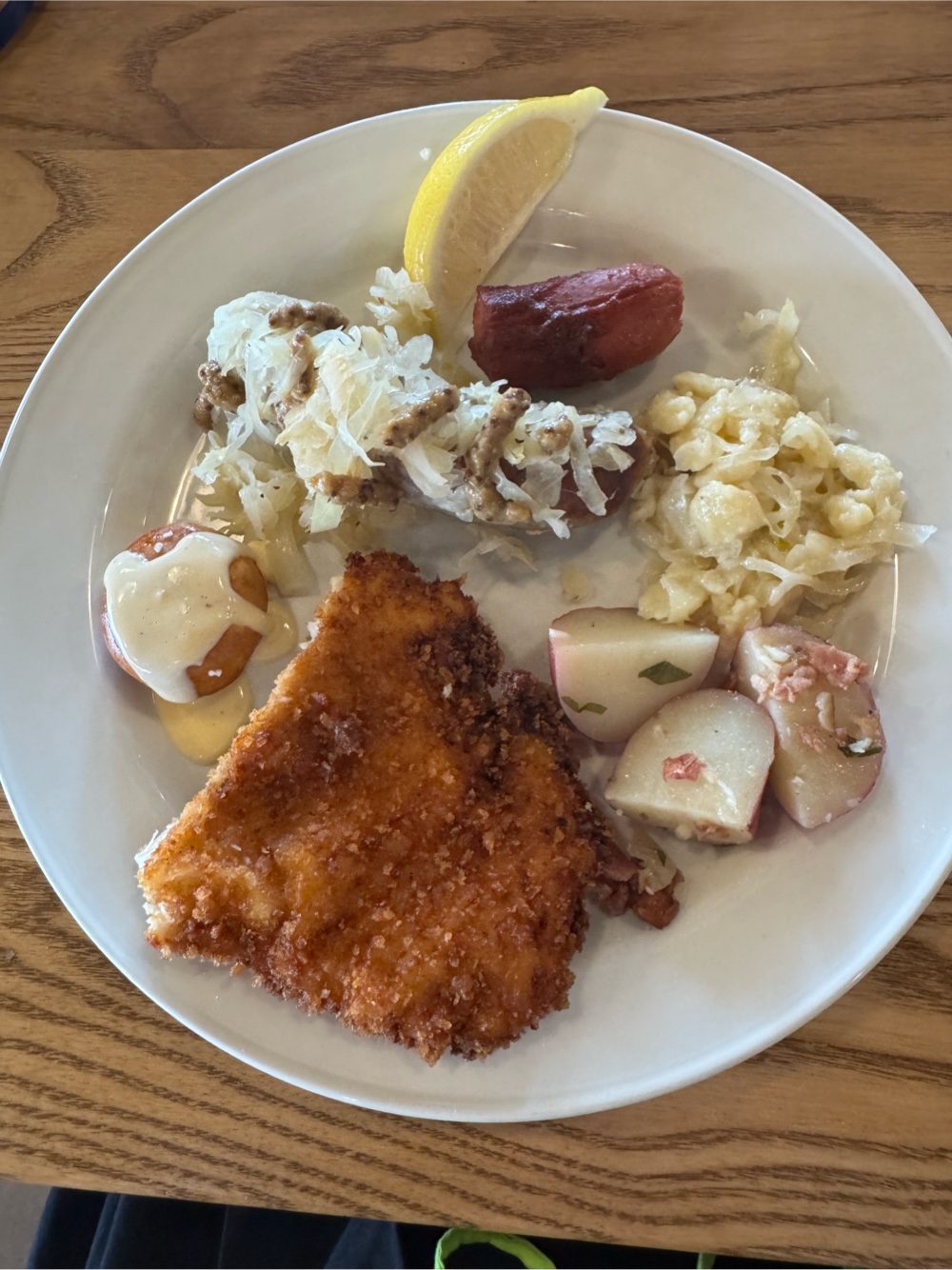 My husband is a second-generation German American. His father grew up in Berlin during World War II and when he immigrated here all alone at the age of 18, he adopted the language and culture of his new home, but never lost his love of homeland. When I started dating my husband, I was introduced to his dad's favorite imported beer, Hofbrau. At that time in the late 80s, it was very hard to find. We'd have to drive an hour to the northwest suburbs to get it at a German restaurant and deli. It was there that I was also introduced to German cuisine and I've been in love ever since. One of my favorite meals is a simple schnitzel (or pork, veal or chicken) with lots of lemon slices to squeeze juice onto. Even better if it is accompanied by sauerkraut, spaetzle, fried German potatoes and red cabbage with a slice of dark rye bread.