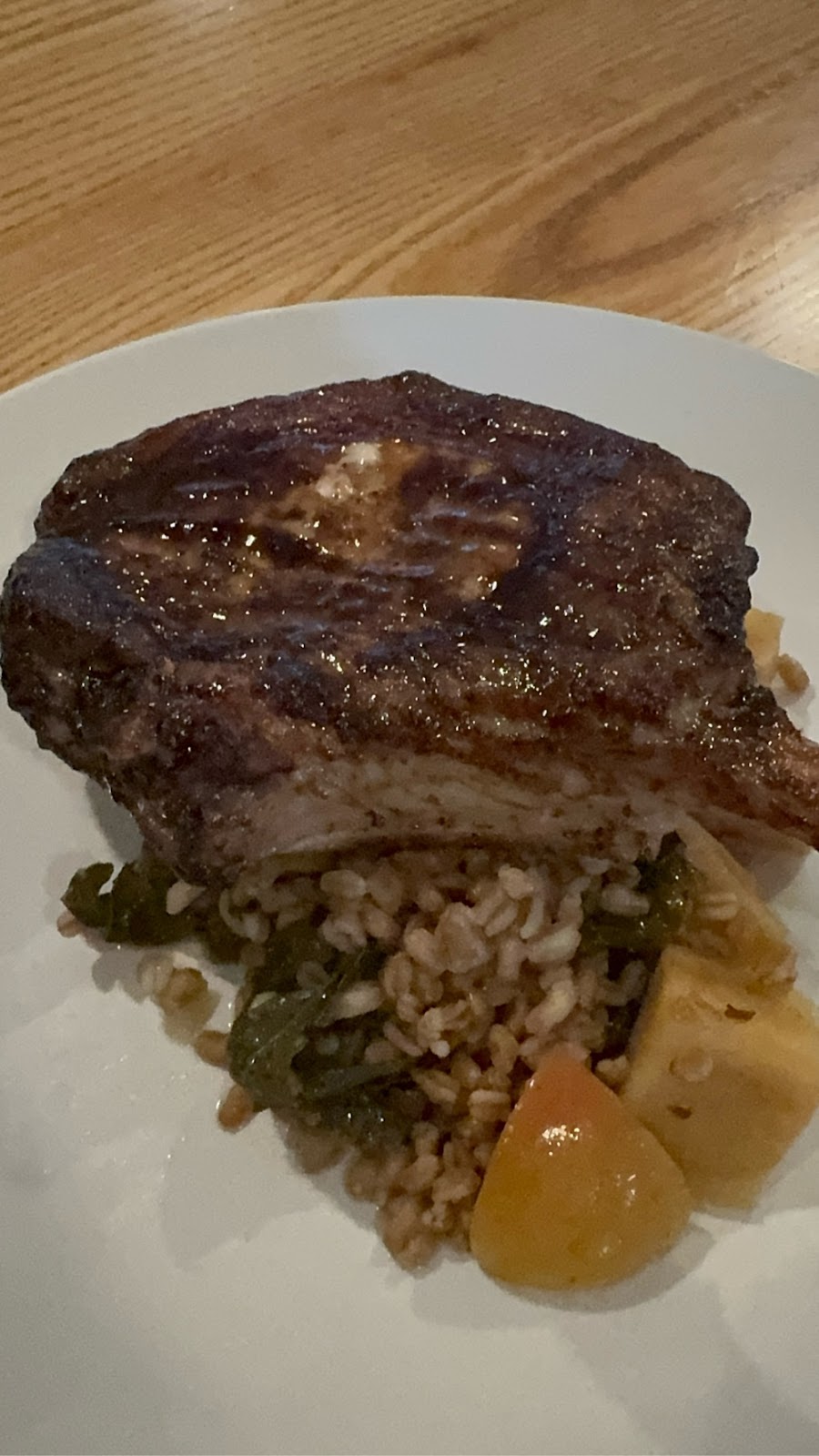 We also tried the Black Garlic and Maple Pork Chop, which was delicious, and sourced from a local farm, Kilgas Farmstead and served with braised greens, farro and roasted apple.